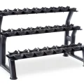 Our 2- and 3-tiered saddle-style dumbbell racks are beautifully designed to hold a variety of our different types of dumbbells. The 3-tiered version is perfect for those with floor-space constraints. With no sharp edges to disfigure your dumbbells, our saddle-style dumbbell racks have biomechanically-designed tiers to make loading and off-loading your dumbbells safer and less labor-intensive. This reduces the chances for injuries to the user during workouts. All of our saddle-style racks are constructed for heavy-duty usage from 12- and 14-gauge steel and can be custom-painted to match any color scheme.